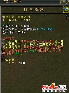 30J 以上组队到(4-8个人) 冰谷镇 民兵处 接任务第一关:逃出升天?云崖密径(杀死狐狸将军·任务中死亡则任务失败·只有选择放弃再接任务)·前面杀完前