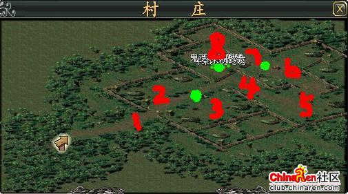 (上面是解救村民副本图。1-8红数字所示为8组怪的分散地点。三个绿点分别是集中杀怪地点)