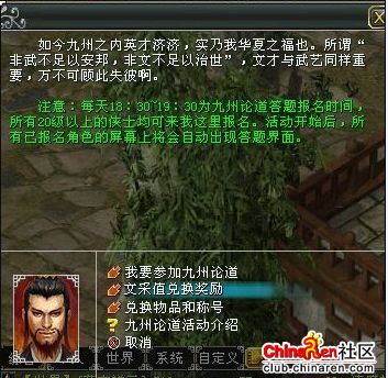 只要你的等级达到20级,即可参加"九州论道"。每天晚上18:30-19:30为报名时间,19:20,你的屏幕上将会出现报名界面