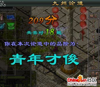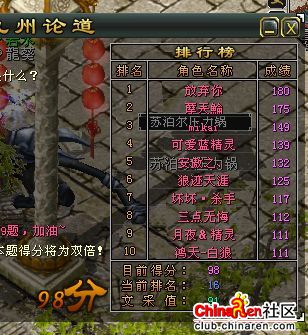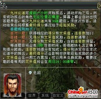 每天的活动积分会在服务器中进行排名,前10名的玩家名字将显示在屏幕右侧排行榜处。前3名的玩家,除了有高额的经验奖励,还能获得额外奖励和特定称号。文采值会在每周日的24:00清零,清零之前能够不断累加。