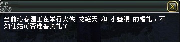 火热的夏天,激情的刀剑,幸福的婚礼!公元二零一零年六月一十九日,农历五月初八,是龙逆天与小蛮腰大喜之日!婚礼于傍晚19点在沁春园准时举行! 龙逆天,人族剑客,90级&小蛮腰,人族剑客,93级 自:Club.ChinaRen.com 备上贺礼,